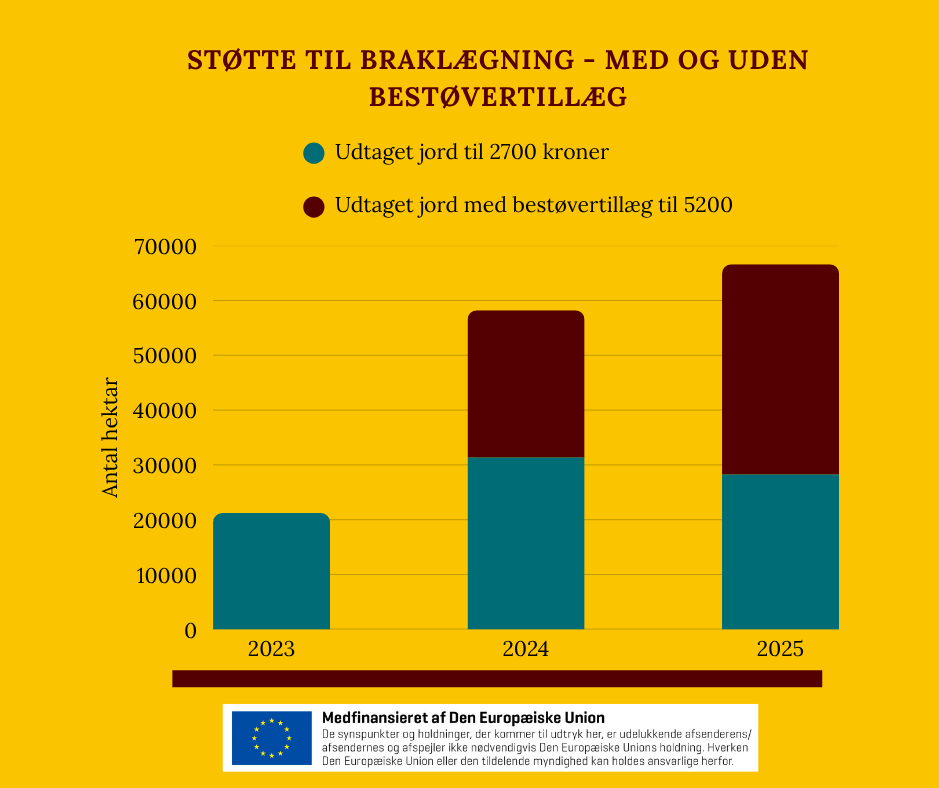 Fra 2024 kunne landmænd ansøge om et tillæg på omkring 1.500 kroner pr. hektar for arealer udlagt som bestøverbrak – ud over den almindelige støtte på 2700 for at tage jord ud af dyrkning.