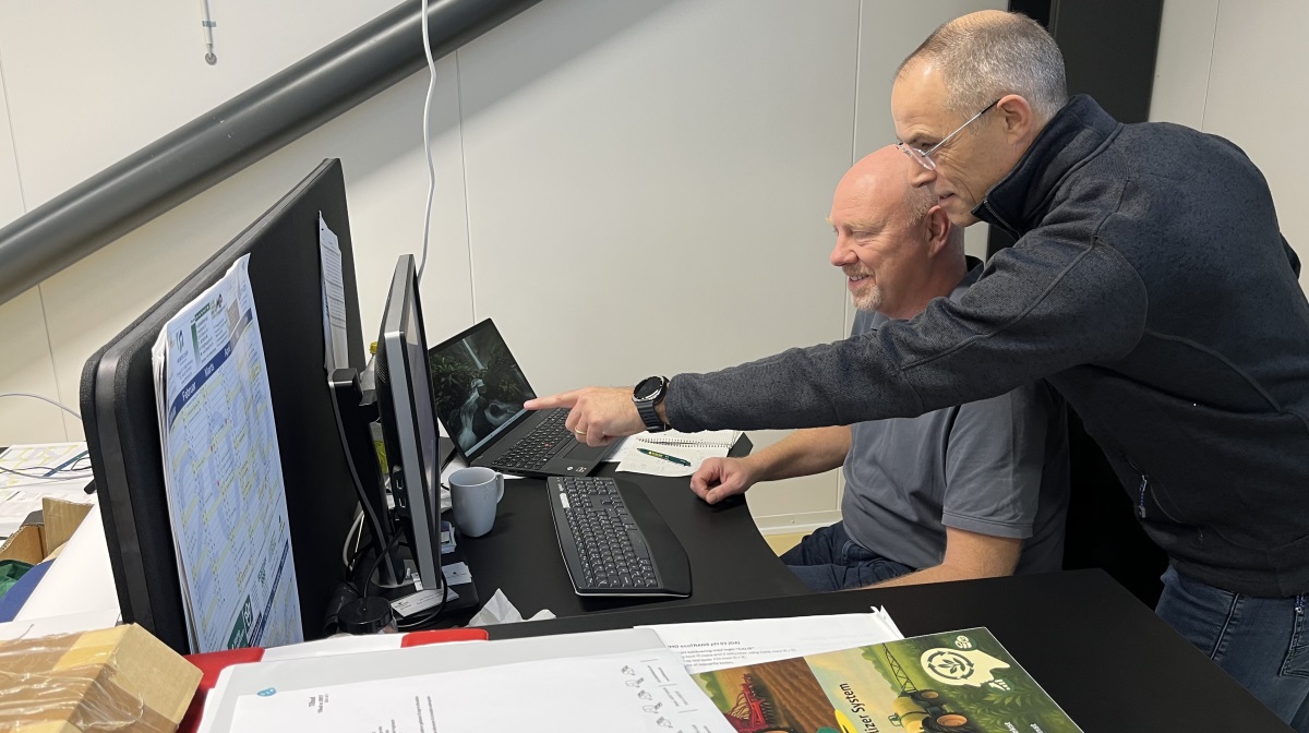 Der er i alt otte ansatte hos Flex Fertilizer System. Her giver produktchef Allan Holm Nielsen sit besyv med om en gødningsplan udarbejdet af den landbrugsfaglige rådgiver Jan Fischer.Vi har sat den 53-årige stifter af tænketanken Growz stævne på hans arbejdsplads, Flex Fertilizer System ApS.