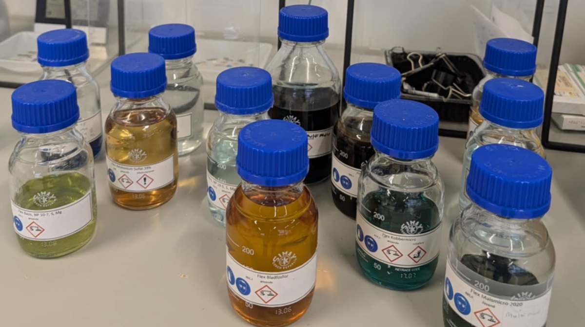 I laboratoriet på Agertoften i Langeskov prøves der nye idéer af. Virksomheden har bladgødning som sit store speciale.Kærligheden til groende planter har han dog bevaret, og det er lykkedes Allan Holm Nielsen at bruge sin åbenlyse passion for de grønne erhverv både takket være jobbet hos Flex Fertilizer System samt i Growz.