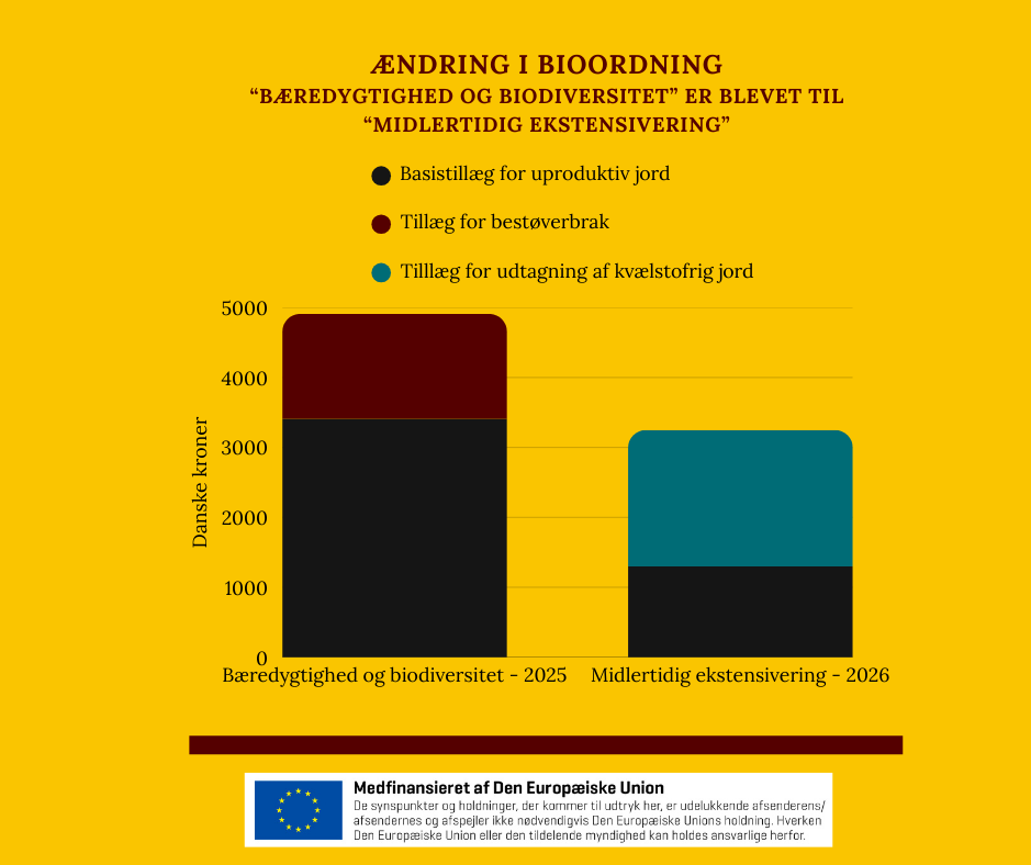 Men med den nye ansøgningsrunde ændres ordningen. Bestøverbrak bliver udfaset og indgår ikke længere som selvstændigt støtteberettiget element fra 2026. I stedet introduceres en ny bioordning med fokus på såkaldt midlertidig ekstensivering, hvor støtten målrettes kulstofrige lavbundsjorde i stedet.